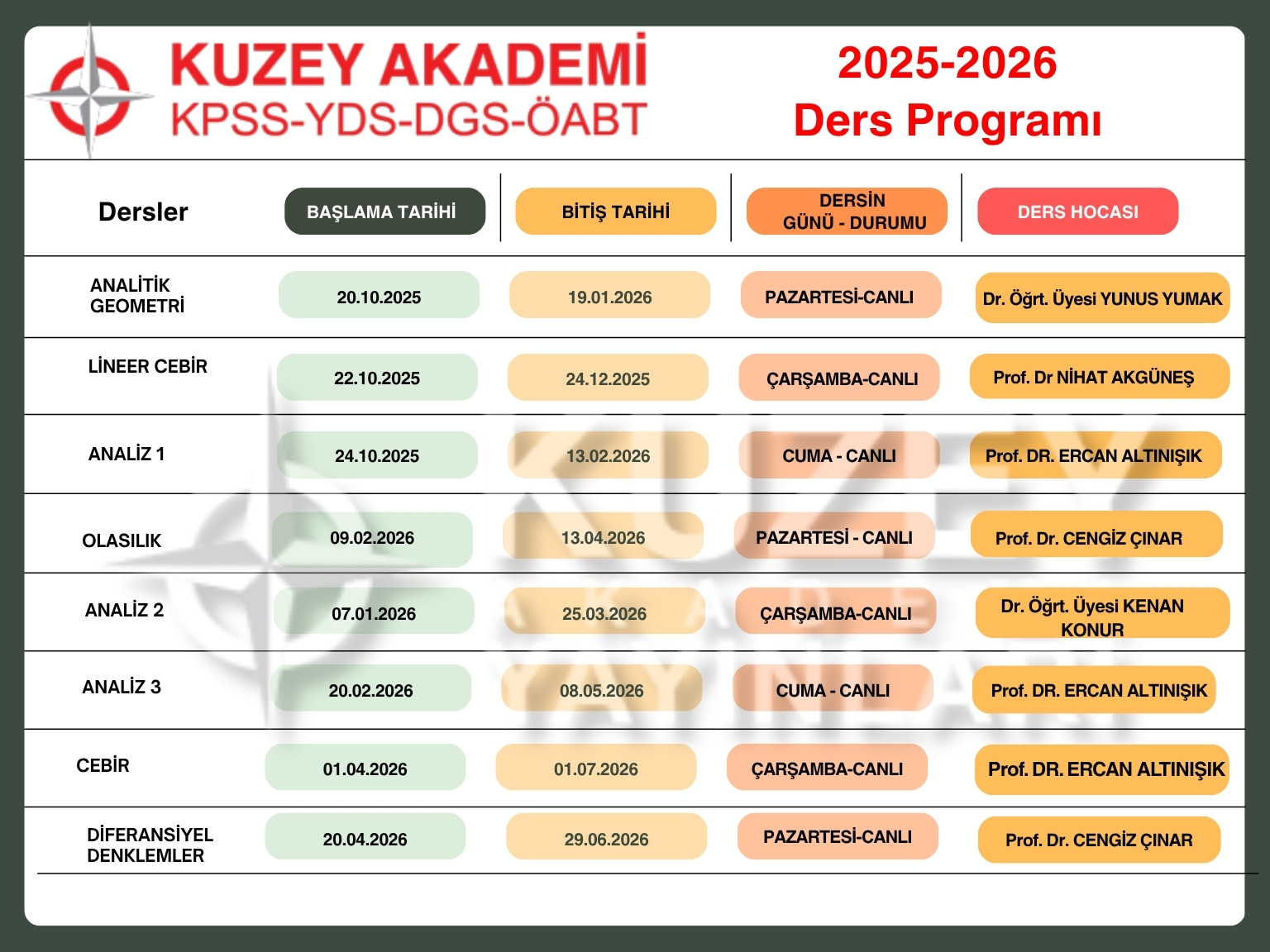 Kuzey Akademi’den bir ilk daha! Prof. Dr. Cengiz ÇINAR koordinatörlüğünde online Matematik ÖABT kurslarımız hizmetinizde. Toplamda 9 ay sürecek eğitimlerle ÖABT sınavı artık korkunuz olmayacak. Kaliteli eğitmen kadrosuyla Matematik ÖABT sınavını başarmanız için her şey hazır. Siz de vakit kaybetmeden kursumuza kaydolun.